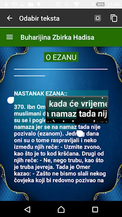 The application is made employing in order to enable wider access and convergence Hadith Muhammad s.a.w.s. Surely that is the authentic collection of hadith is an enormous treasure trove of knowledge of the Sunnah of Allah's Prophet Muhammad s.a.w.s. From the life of our Prophet Muhammad s.a.w.s. we need to draw a huge source of knowledge that will please God put into our lives. He said Muhammad s.a.w.s.:- leave you two things which if you stick you will not go astray, the Book of Allah and my Sunnah. (Tirmidhi, Hakim Malik).