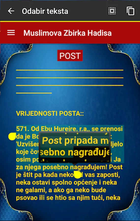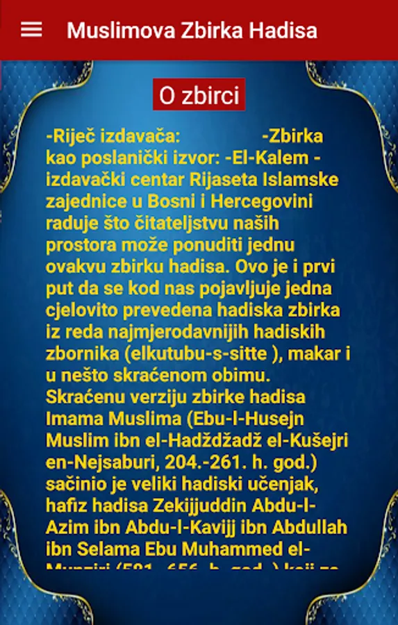 The application is made employing in order to enable wider access and convergence Hadith Muhammad s.a.w.s. Surely that is the authentic collection of hadith is an enormous treasure trove of knowledge of the Sunnah of Allah's Prophet Muhammad s.a.w.s. From the life of our Prophet Muhammad s.a.w.s. we need to draw a huge source of knowledge that will please God put into our lives. He said Muhammad s.a.w.s.:- leave you two things which if you stick you will not go astray, the Book of Allah and my Sunnah. (Tirmidhi, Hakim Malik).