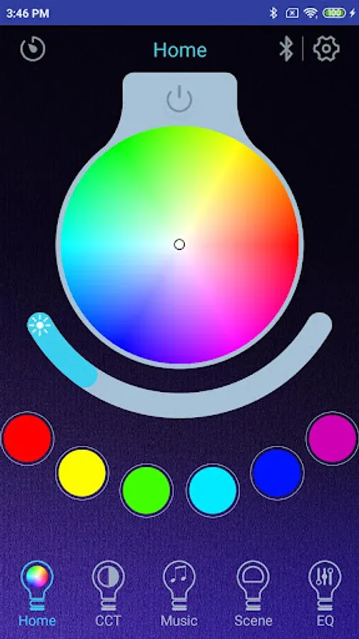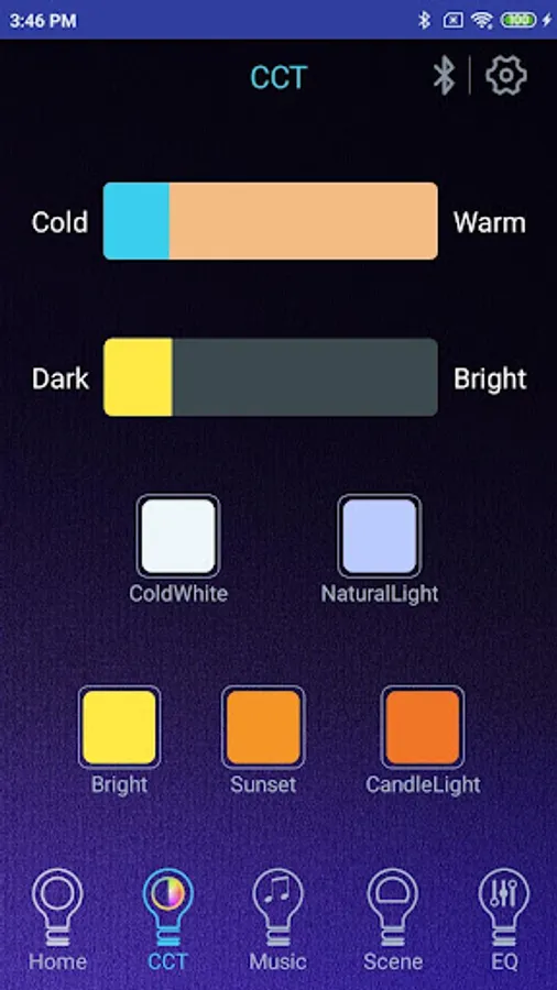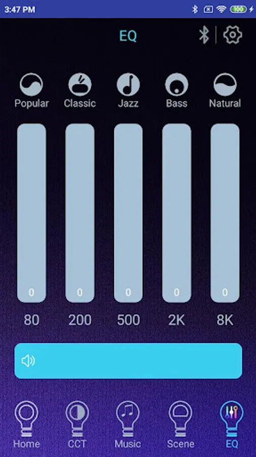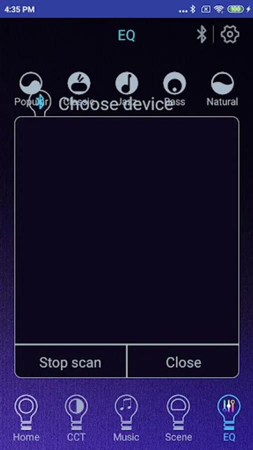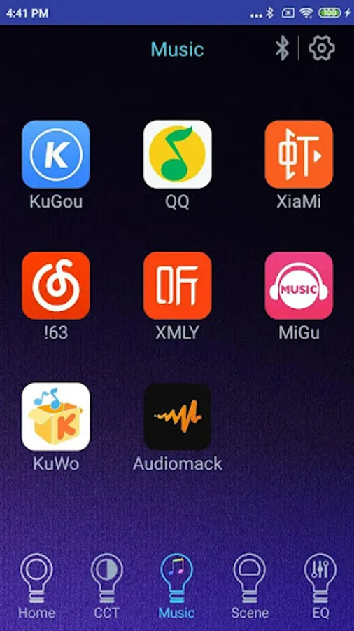 Through scanning and automatic connection of Bluetooth lamp, the app can switch lights, adjust color lights, color temperature lights and brightness, switch scenes, play music, adjust volume and equalizer.