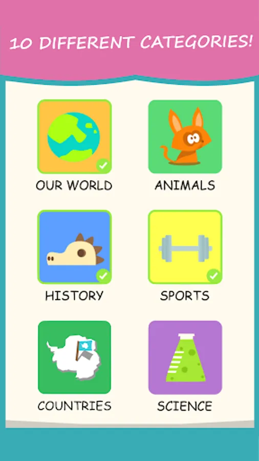 - 10 categories: our world, our body, animals, history, flags, sports, capitals, countries, art and science,