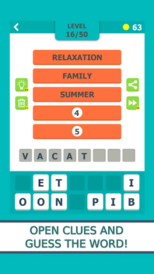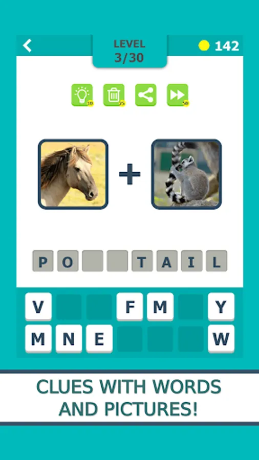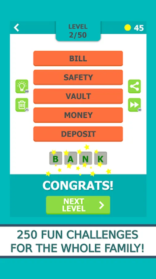 There are two game play modes in the game. In the first, for each level you will have 5 associations in the form of words, while in the other, the tips are given in the form of pictures. Your goal is to find a solution that combines all these words or images. The fewer clues you use, the greater is the final reward. If you get stuck at one of the levels, you can use one of the three types of help.