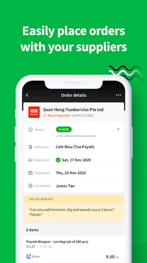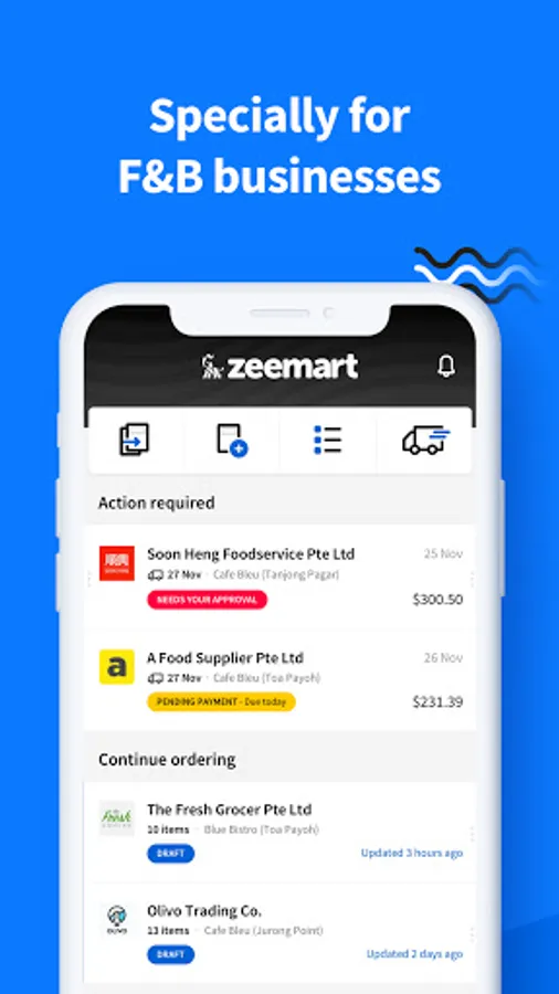 Quickly place orders for F&B supplies from your suppliers, on your mobile phone. If you’re in Singapore, you also get access to thousands of items from trusted suppliers in our Zeemart Essentials catalogue.