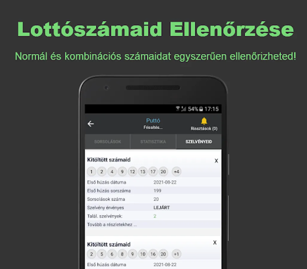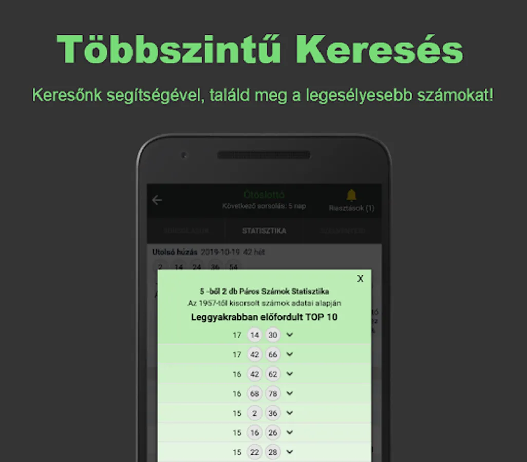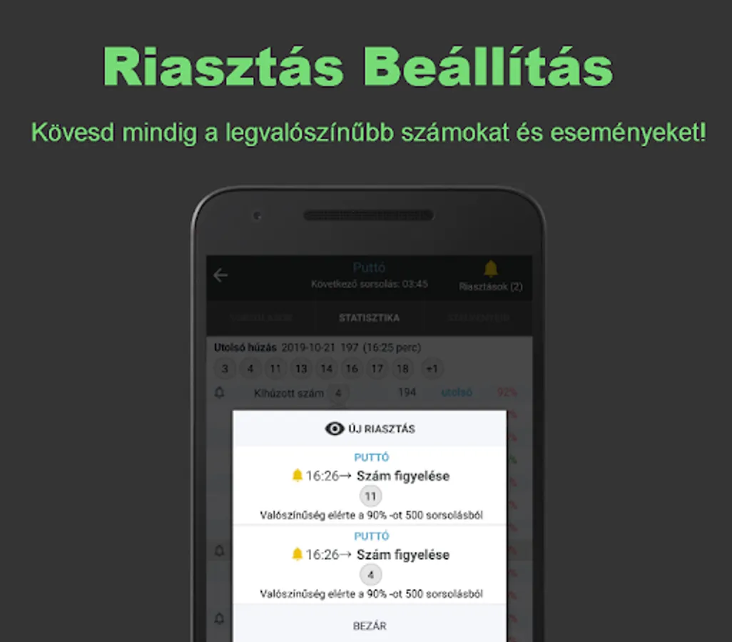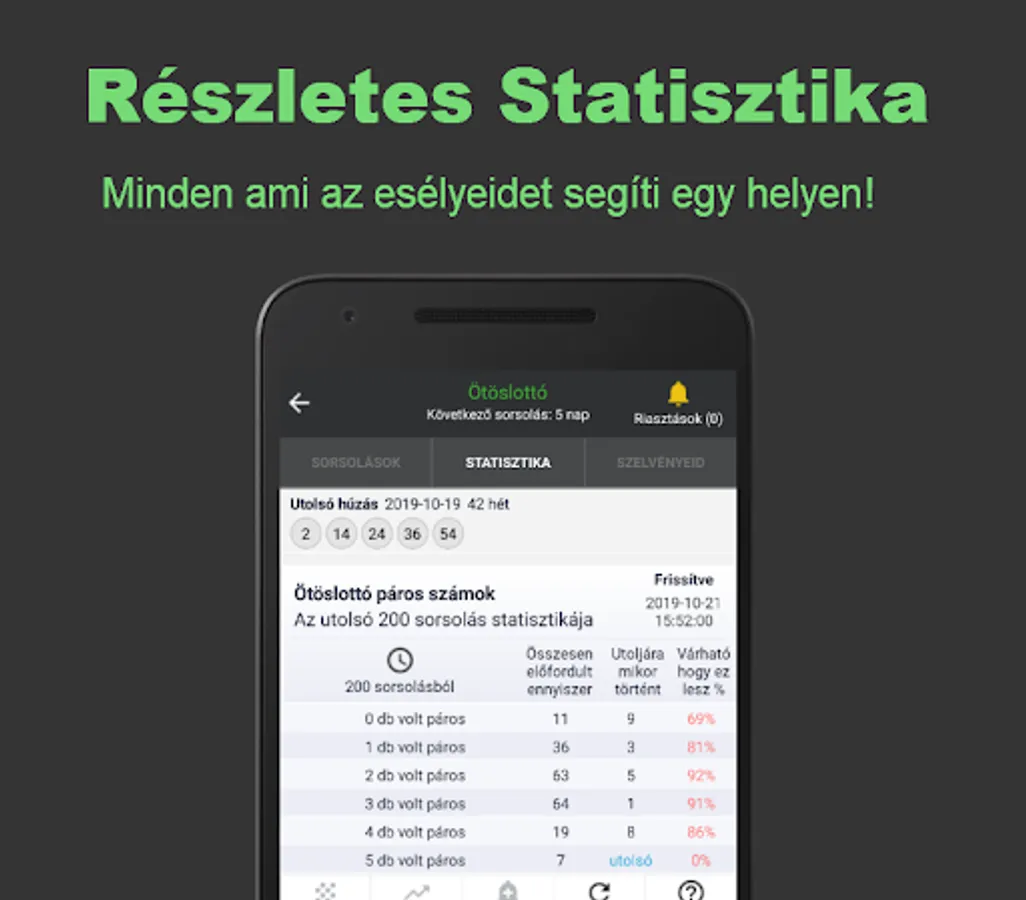 From the beginning to the present, the app generates the latest statistics by analyzing the millions of lotteries drawn, which will help you to choose the winning numbers for the coming period with the best possible chance. The statistical analyzes of the app apply to all lottery games of the Hungarian Szerencsejáték Zrt. Depending on the game, you will always receive information based on the latest draw results, with Putto updated every 5 minutes. The app helps with more than 60 statistical tables that are easy, understandable, displayed in percentages. With the built-in alarm function, you can always be informed in time about the numbers or best number ranges you have selected.