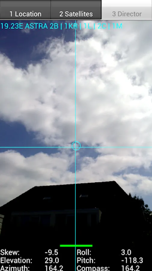 Just enable the GPS in your phone or enter your GPS location, select the desired TV satellite or antenna location and point your phone to the sky to target (find) the TV satellite. You have found the satellite when the white ball is in the white circle and the cyan ball is in the cyan circle. Align, in azimuth, the offset arm of the satellite dish to the cyan arrow on the phones display and the satellite dish is aligned in azimuth with the satellite.