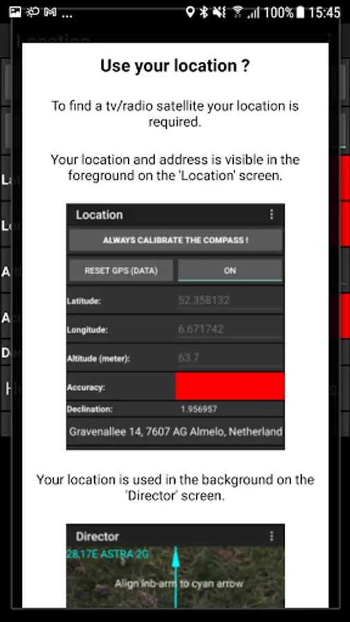 Access to a camera is required to imitate a 'look through view' or 'mirror effect' which allows to align the satellite dish (lnb arm) with the displayed arrow.