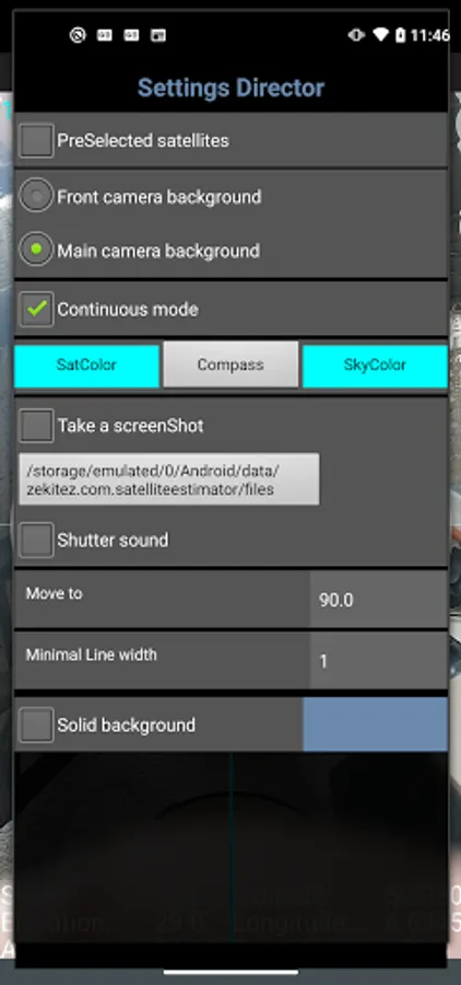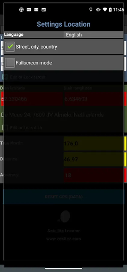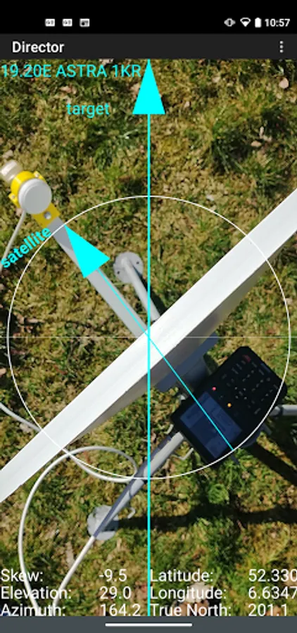 2- The GPS location of the satellite dish and the GPS location of a target (or reference point) is needed. The target can be the GPS location of a house, tree, plant, etc. Just enable the GPS in your phone or enter the GPS locations with the help of Google Earth/Maps (satellite dish position and a visible target position).