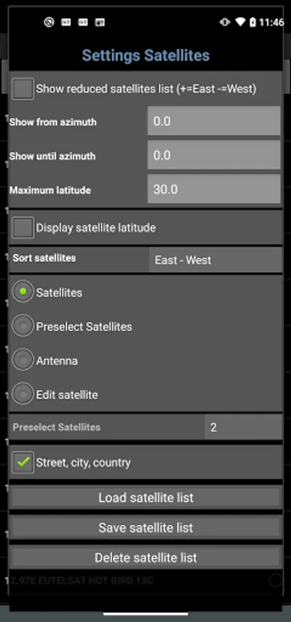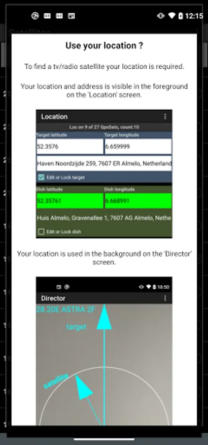 WARNING: when you are close to or in between walls, roofs, sheds, trees, houses, flats or close to metal the phone's GPS location can be totally wrong which will result in a faulty satellite position !! Your satellite dish and target should be preferably in an 'open space'.