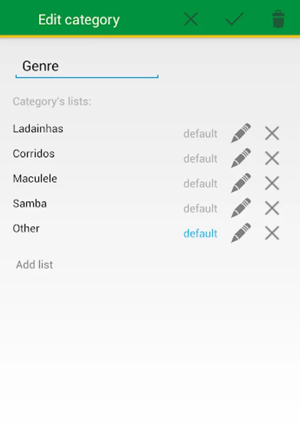 you can even group several lists into one category (e.g. the songs lists "Corridos" and "Ladainhas" are grouped into "Genre" category).