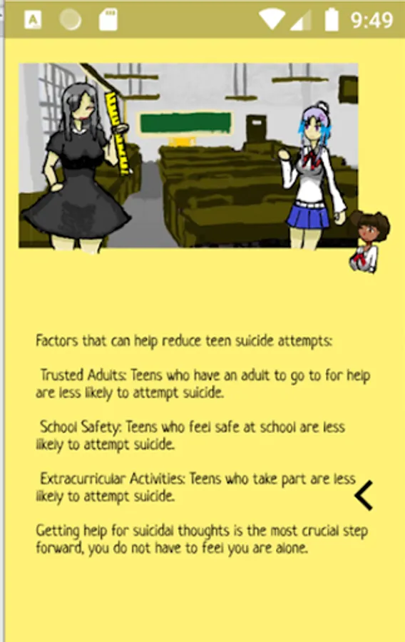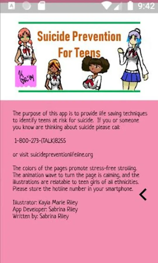 The colors of the pages promote stress-free strolling. The animation waves to turn the pages are calming, and the illustrations are relatable to teen girls of all ethnicities. The National Suicide Prevention Lifeline is incorporated. If you need help call 1.800.273.TALK (8255). Your call will be connected to the crisis center nearest to you. If you are in an emergency, call 911 or go to your nearest emergency room.