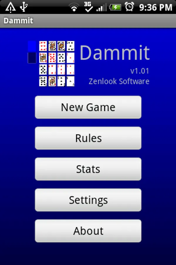Dammit (a.k.a. King's Corners) is a fast, easy-to-learn, addictive card game for Android. Draw cards one at a time from the deck. Place kings in the corners, queens top and bottom, and jacks left and right sides. After the board is full you can remove tens or pairs that add to 10. If you draw a jack, king, or queen and the spaces are full - game over.