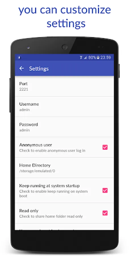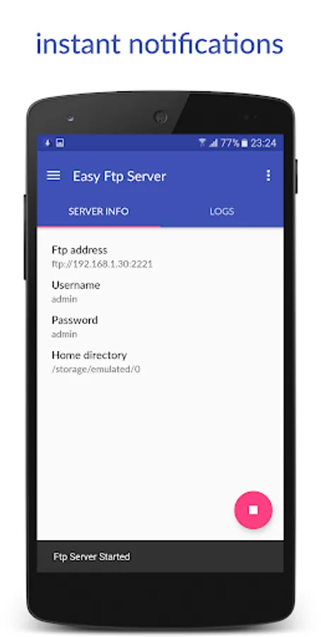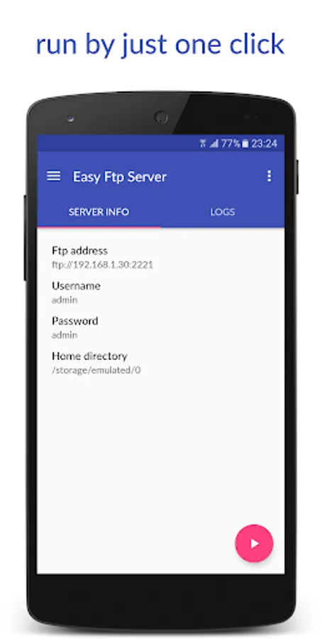 Easy , fast and useful ftp server for your phone. You can run just one click or customize settings. Ftp server info for client connections appears on home screen.