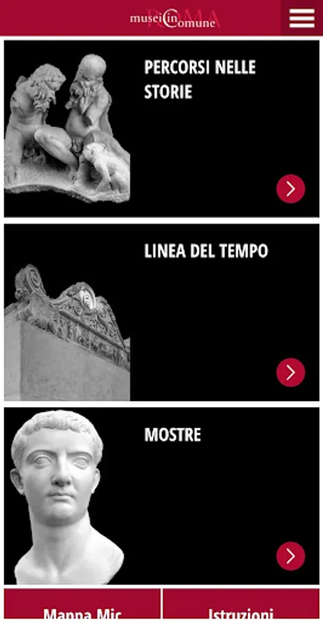 The application, available in five languages (Italian, English, français, deutsch, español) presents three macro-sections: Paths in the stories, through which it is possible to access thematic paths with predetermined duration, Time line, with macro-line of the time in which the museum's works and the main related historical events are inserted, and Exhibitions, with a detailed description of the exhibitions in the circuit of the Museums in the Municipality.