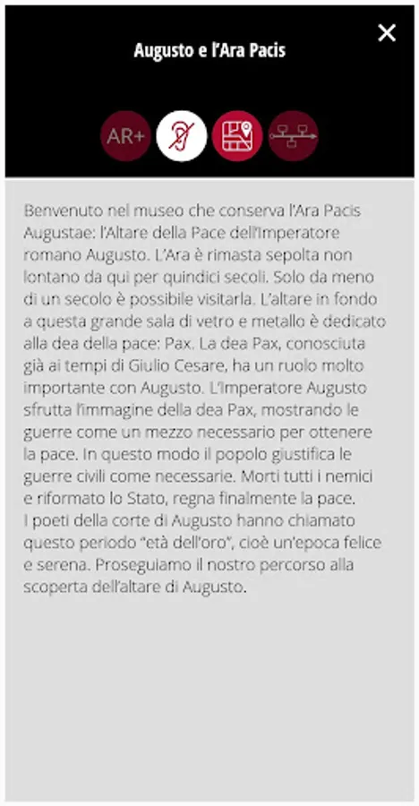 The application allows you to discover the collection of the Ara Pacis Museum in a simple and exhaustive way, through the stories of the monument, conveyed through a lively storytelling, entrusted to the voice of an exceptional storyteller, the same Pax, the deity officialized by Augustus to whom the Ara Pacis was dedicated, which leads visitors to discover the monument.