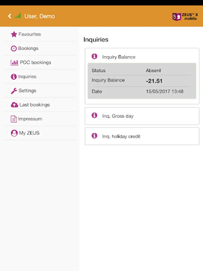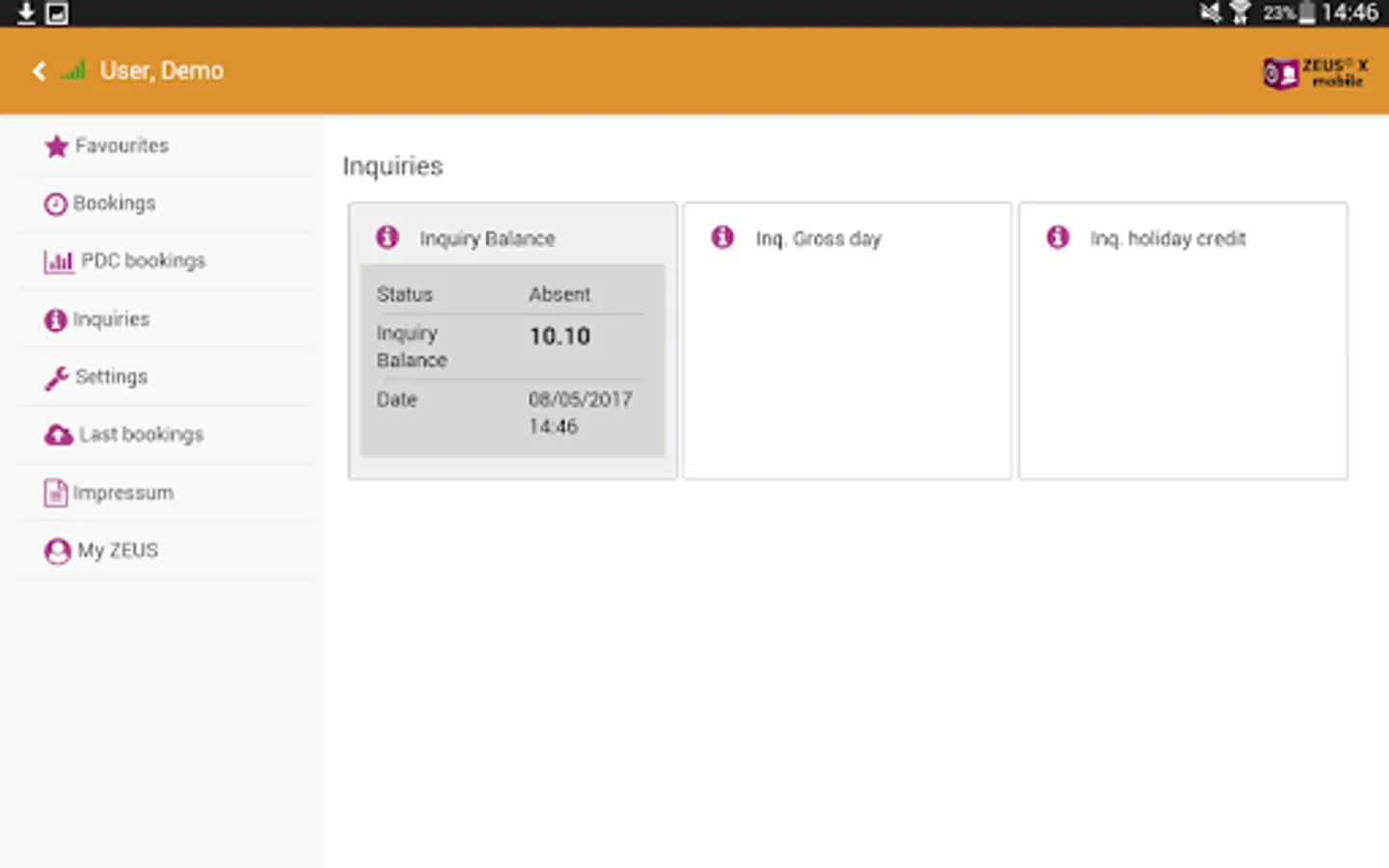 ZEUS® X mobile plus allows you to record working, project and order times at any time and where ever you are. This mobile App stands for easy communication with co-workers and supervisors via embedded workflows. Furthermore, it assists you in keeping track of your time accounts, remaining holidays and much more at a glance. With predefined events you will be automatically informed via the integrated messenger either by e-mail or push notification.