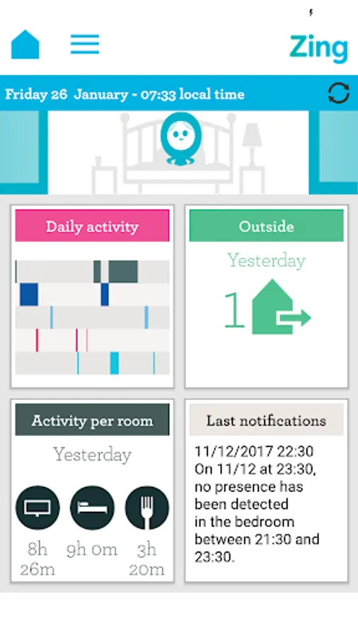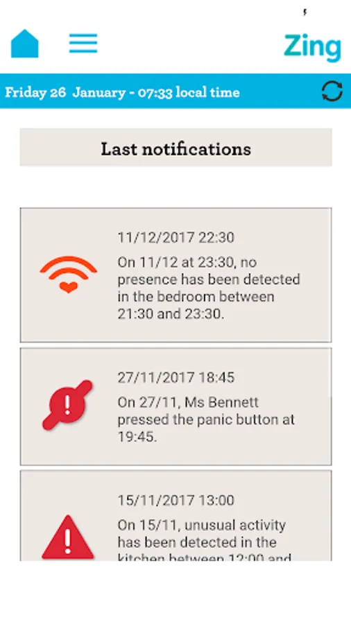 This app requires Zing's innovative telecare to be installed in the house of the person you are monitoring.
