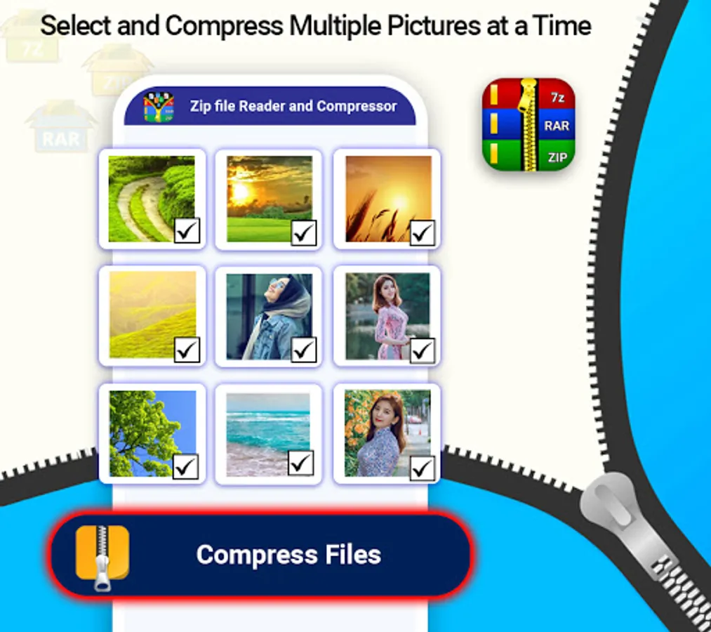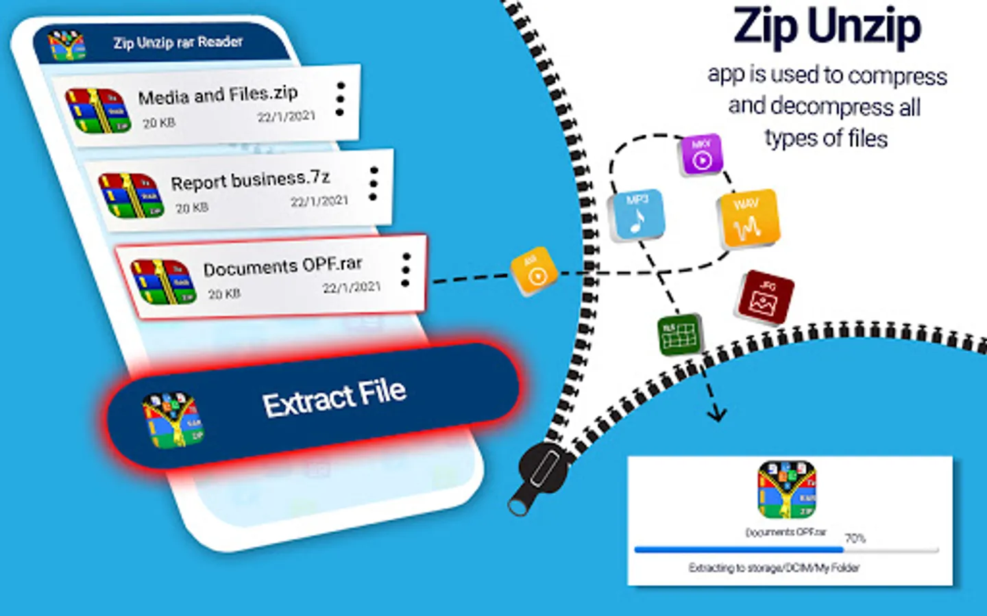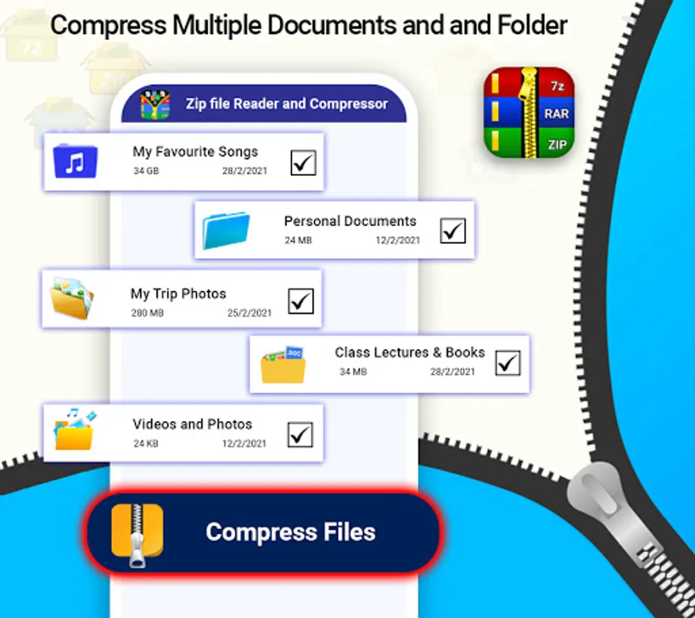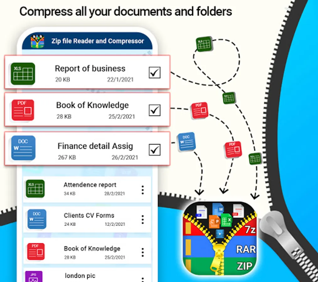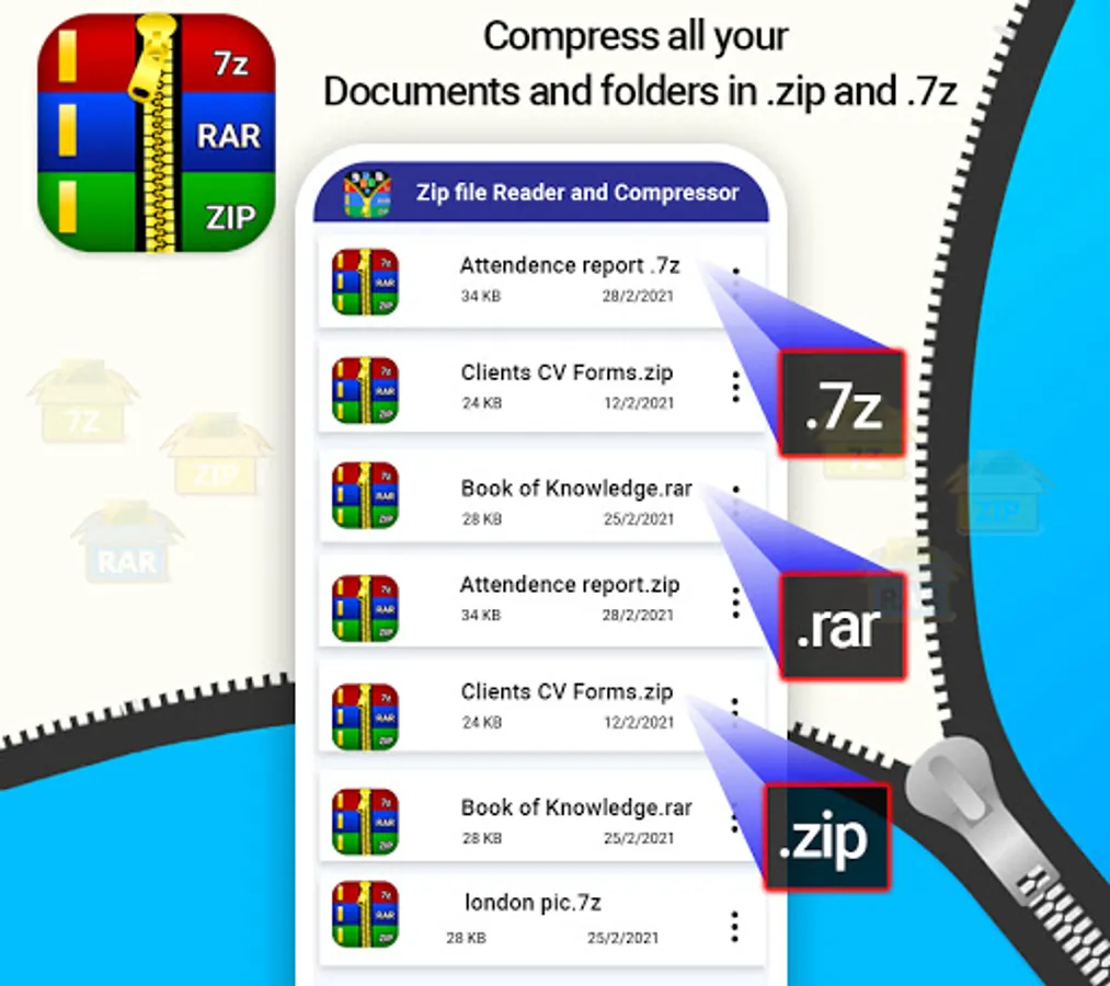 Our app ZIp files Unarchiver and zip file extractor is a simple zip opener which extract your rar files and zip file in no time. It’s a free zip file opener and file compressor app through which you can open zip files and compress zip files without any subscription cost.zip file opener and compressed zip file viewer is best app for your android phone because some time you receive some important zip files through your email and you open that email in your mobile then you can extract zip file to unrar files through this zip opener. With Zip and Unarchiver tool and zip file opener you can reduce the number of files to one file to share it easily to your email or any other plateform.zip file manager and rar extractor is also help full for you when you want to compress or extract you documents files like word files, ppt files and XLS also you can zip PDF files as well.it supports .7z files .rar files and .zip files and may more extensions.Through this zip and unrar tool you can compress all you media file in your phone like you can Zip your picture, you can unZip videos and view all zip files of your phone at one place .this zip app and unrar reader automatically find and scan all zip files, rar documents and zip media in app and you can open zip file in no time from there. So download this easy unrar and zip extractor file from Google play Store freely.