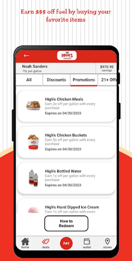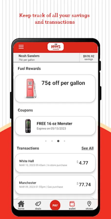 The High’s Rewards program is a free rewards program that helps you save money on fuel and convenience store items across all High’s Stores. Join High’s Rewards to receive surprises, club programs, and offers that match your preferences. You can earn additional fuel savings when you register for Carroll Pay and also pay with your phone at the gas pump or inside.