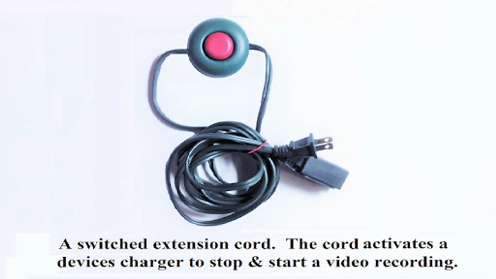 Powering up a device's charger will START a recording. Powering down the charger will PAUSE a recording. A switched receptacle strip or a ‘Christmas tree extension cord with foot switch’ may be used to activate the charger. Lighted switches will show the state of the device's charger. A 'Tripod Adapter' may be used to hold the device in place. A working recording will be saved to the internal memory of your device within its picture GALLERY.