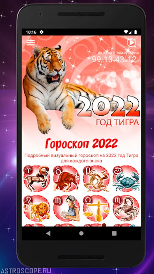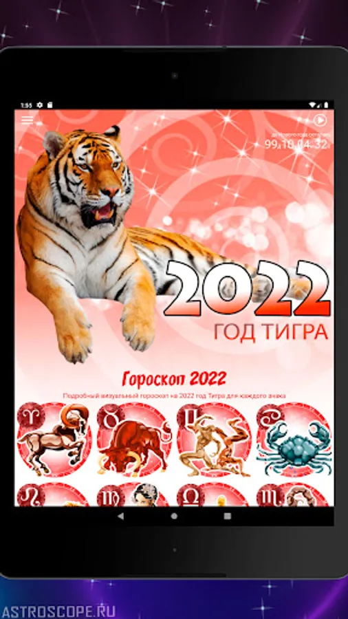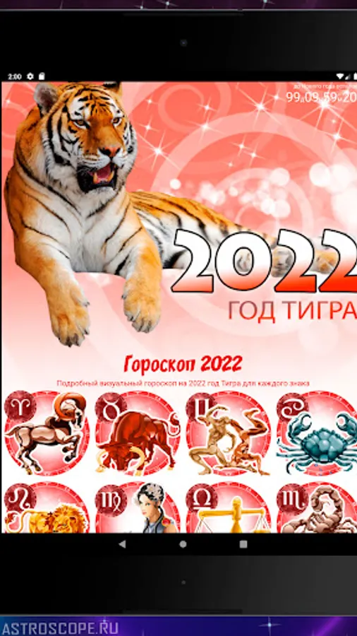 Everyone who has installed the application gets the mascot of 2022 for their use. By placing a wallpaper with the image of a Tiger on the screen, you gain confidence that the hostess of 2022, throughout its entire length, will provide you with invisible support. It is not for nothing that authoritative astrologers are convinced that every person who wants to make the most of the opportunities of this period should have a talisman with the symbols of the year.