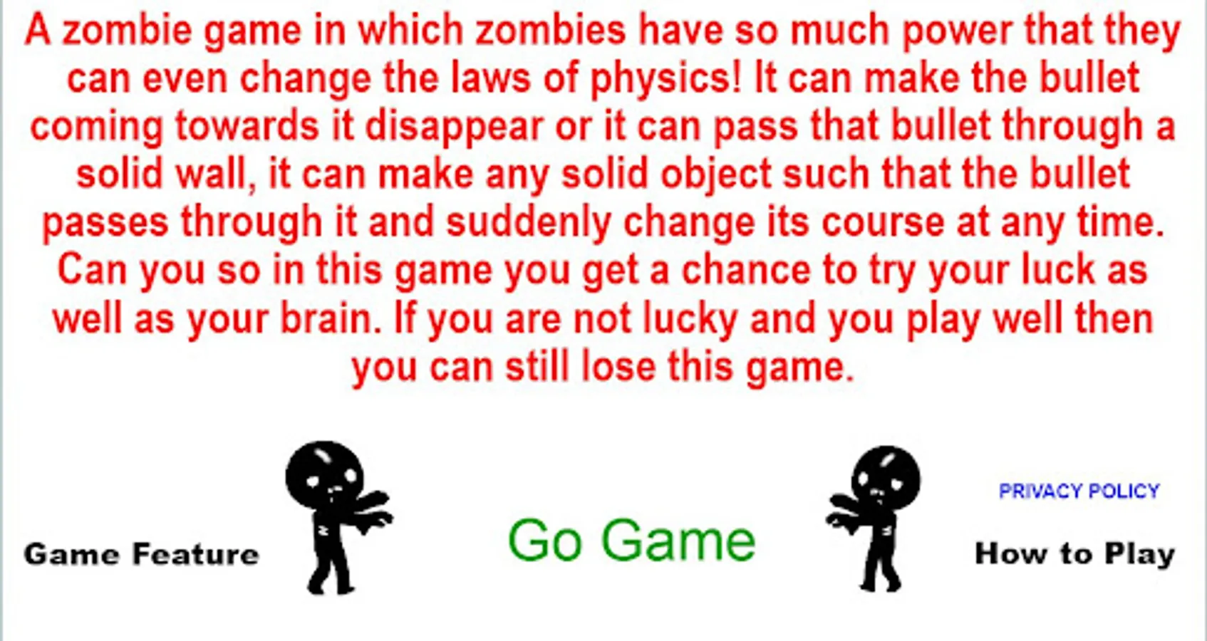 A zombie game in which zombies have so much power that they can even change the laws of physics! It can make the bullet coming towards it disappear or it can pass that bullet through a solid wall, it can make any solid object such that the bullet passes through it and suddenly change its course at any time. Can you so in this game you get a chance to try your luck as well as your brain. If you are not lucky and you play well then you can still lose this game.