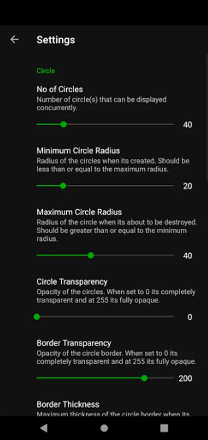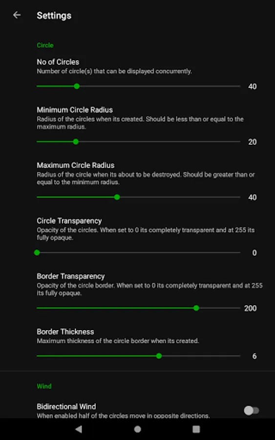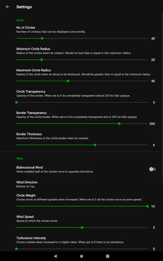 - Contains tons of settings for manually tweaking the number of circles, radius, thickness, wind speed, wind direction, touch sensitivity and much more based on your preference.