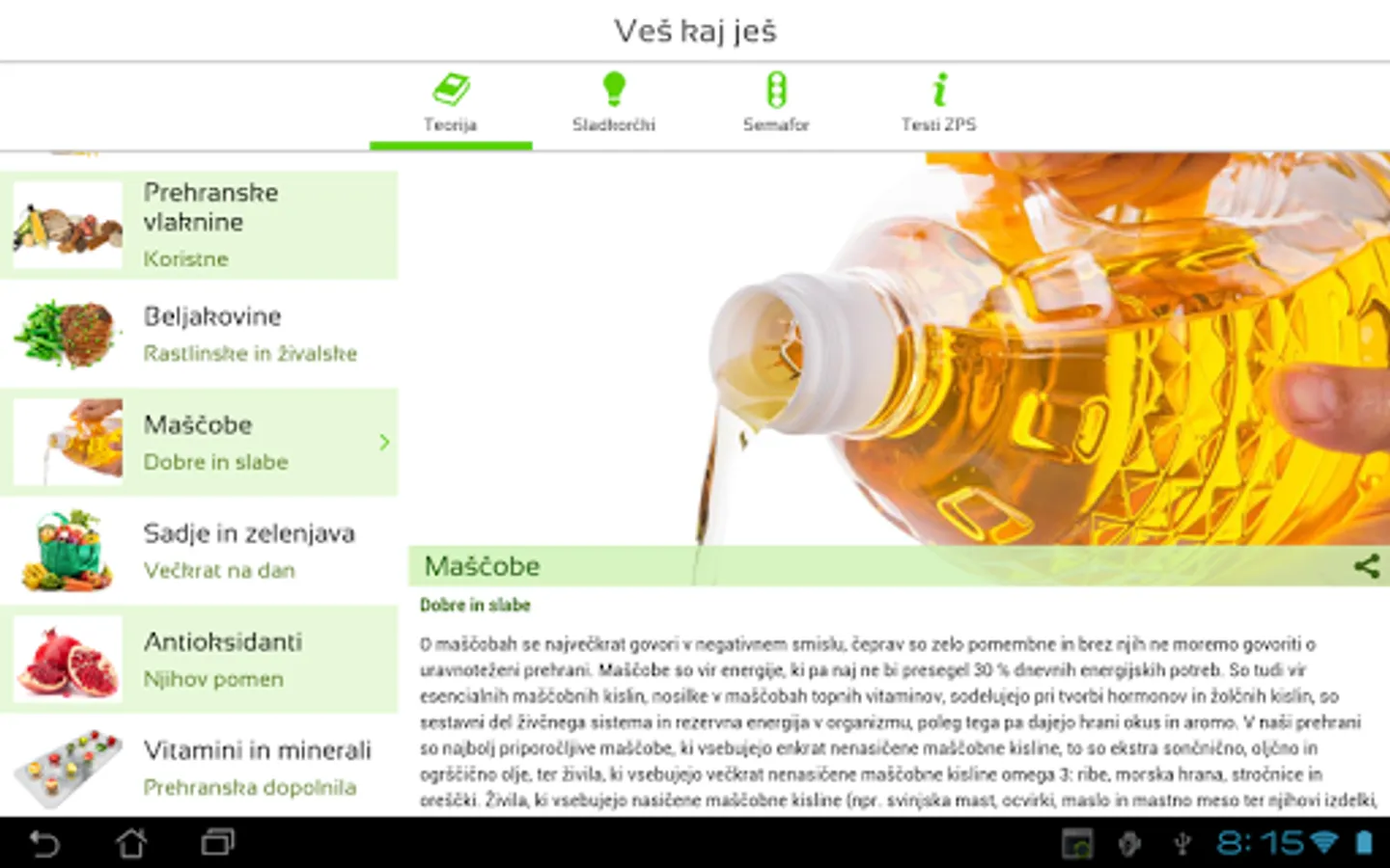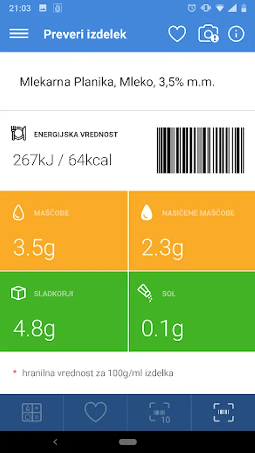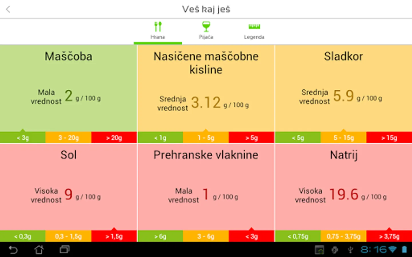 In the context of a varied and balanced diet, the body needs to have an adequate amount of nutrients. It is recommended to limit the amount of consumed sugar, salt and total and saturated fats, so the application displays their quantity in traffic lights. Lower values are colored green, high and red. In the latter case, be especially careful not to eat too much or too often. In order to make it easier and easier to choose between foods, you can simply compare their nutritional composition with the application.