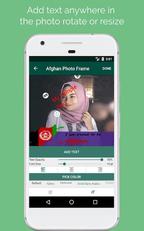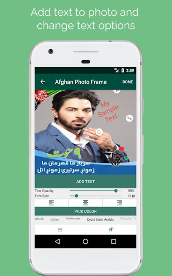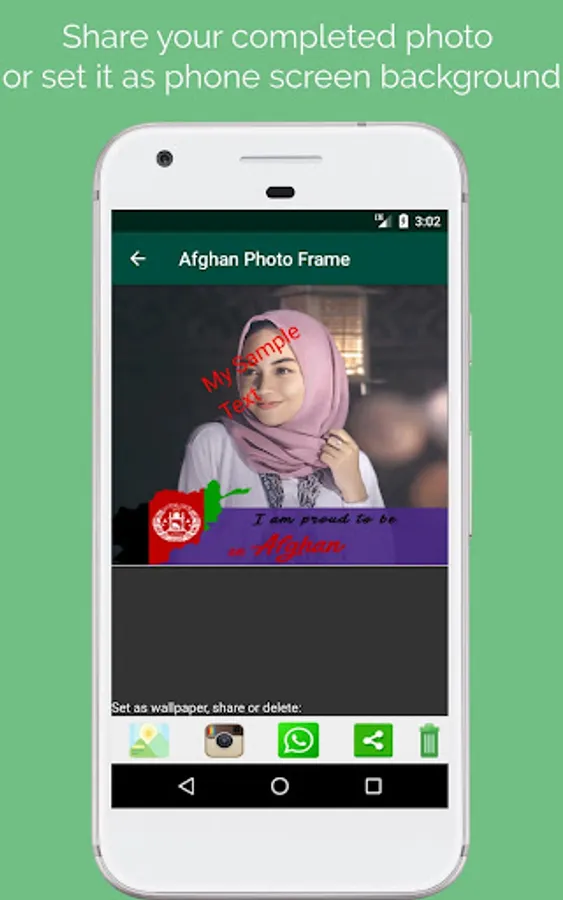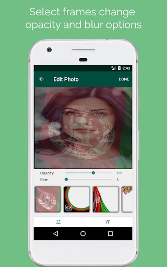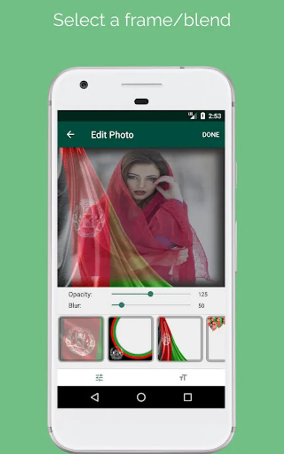 Use this awesome app and get creative with your photos. With Afghan Photo Frame you can choose from many frames/blends to change your photo's background or add frames to it and then share with friends on social media or set as your phone's background image.