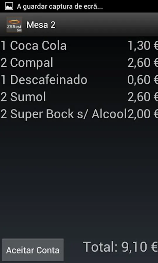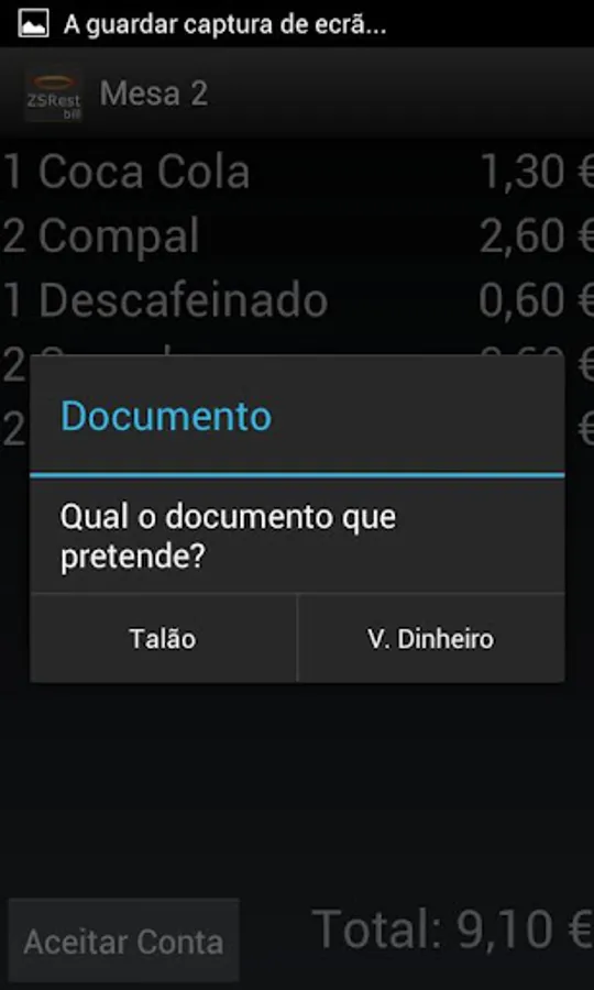 Application to use in conjunction with ZSRest, which allows to take account of a table to his client on any Android device, so that the customer can confirm, choose the type of payment you will, as well as the type of document you want.