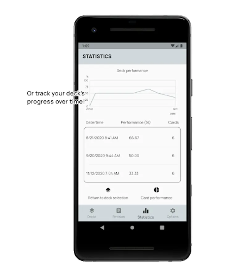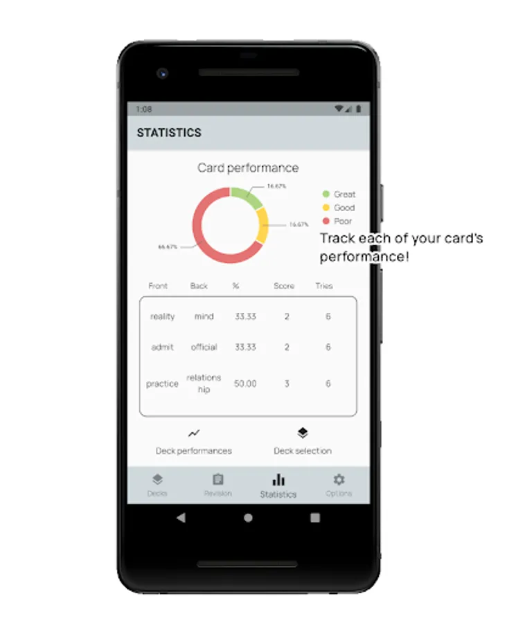 - Measure the performances of each individual flash card based on your own thresholds; or the deck as a whole over time. Identify flash cards that require more work and track the progression of your revisions.