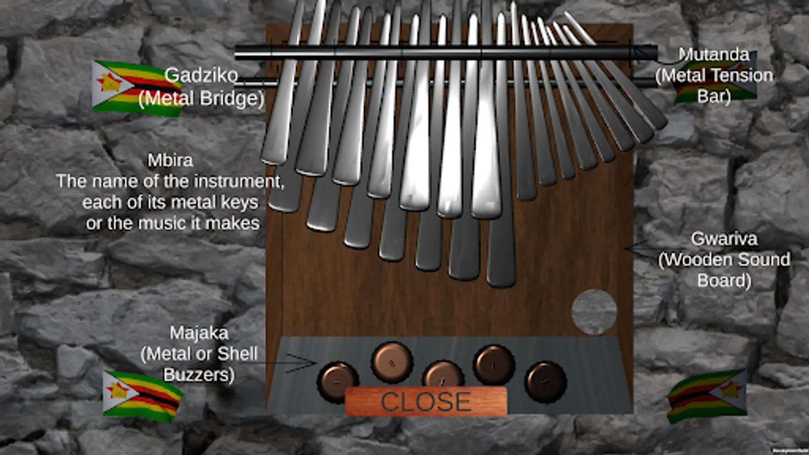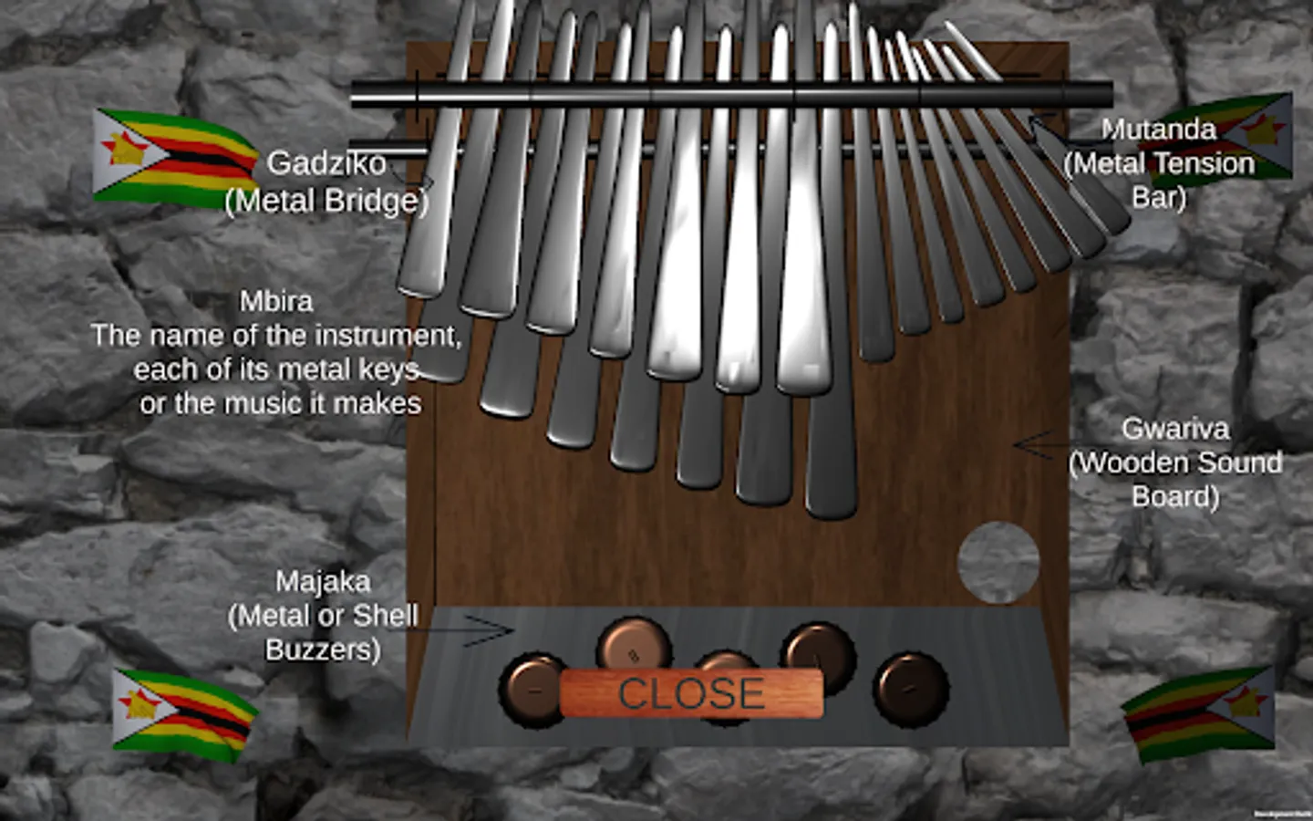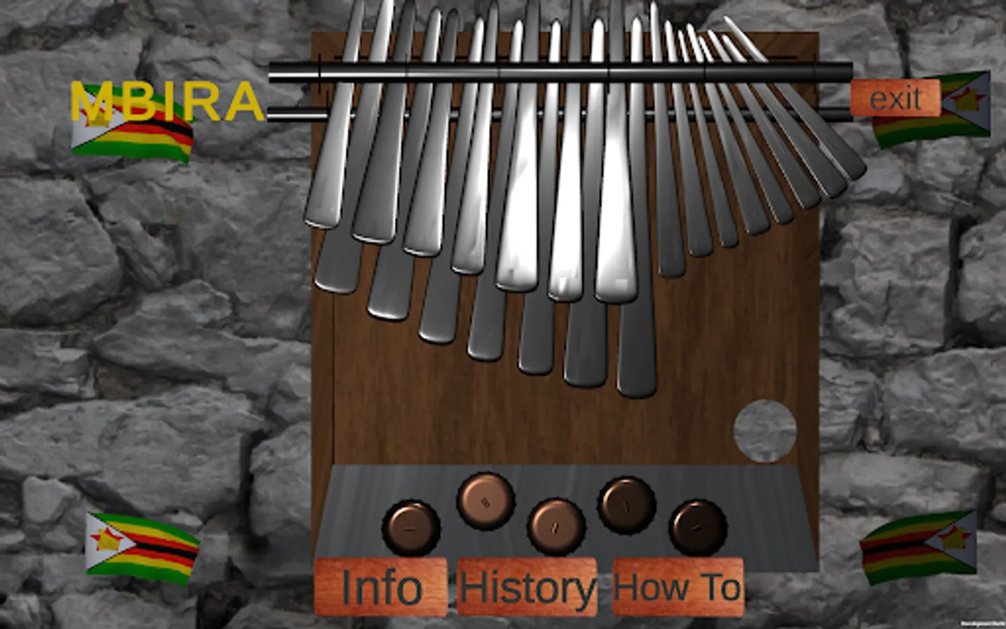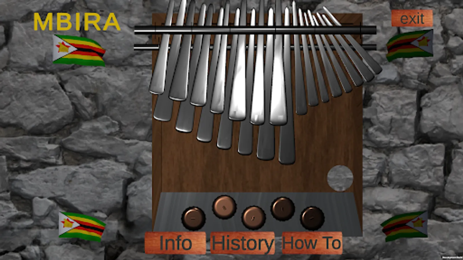 This app is a digital version of the Mbira Musical Instrument. The Mbira is a traditional musical instrument native to the people of Zimbabwe.