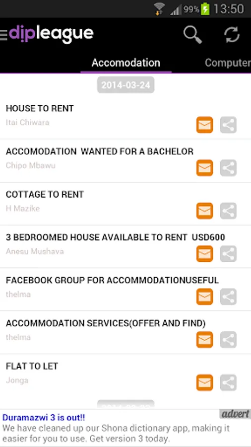 Browse and search the Dipleague mailing list linking you with buyers and sellers in Zimbabwe. Neither an email address, nor registration is required to use this app. With new offers for accommodation, products and services being made every day, why should you miss out on these opportunities.