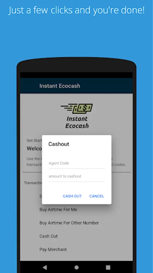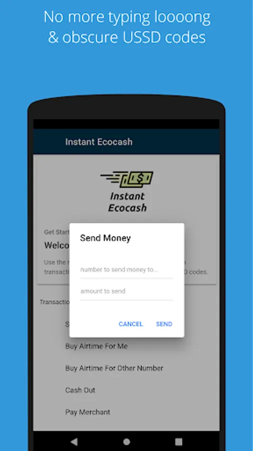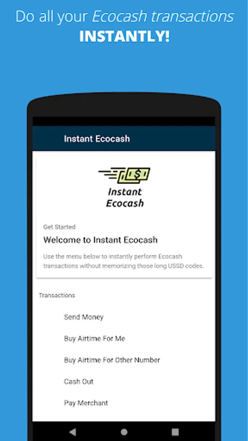 The Instant Ecocash App helps you to do your ecocash transactions faster! No more memorizing long codes like *151*...blah blah, just click an option, enter amount and confirm your pin. Just like that!