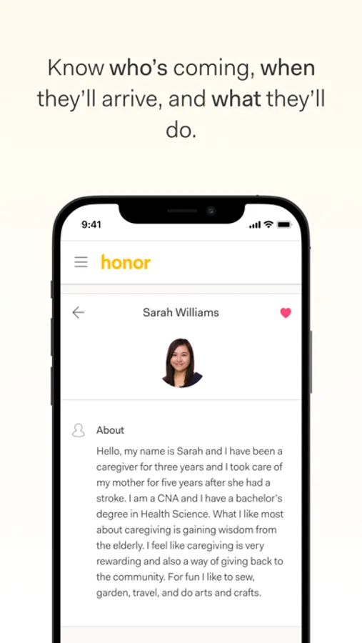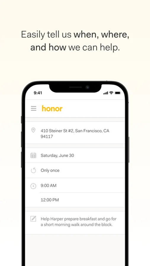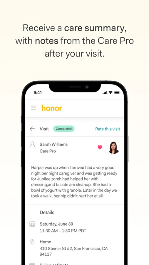 Honor provides in-home senior care, helping older adults continue to live well and independently at home. The Honor Family App lets you know who’s coming to the house for a care visit, exactly when they arrive and leave, and what tasks have been completed. It’s never been easier to manage care and companionship for yourself or your loved one.