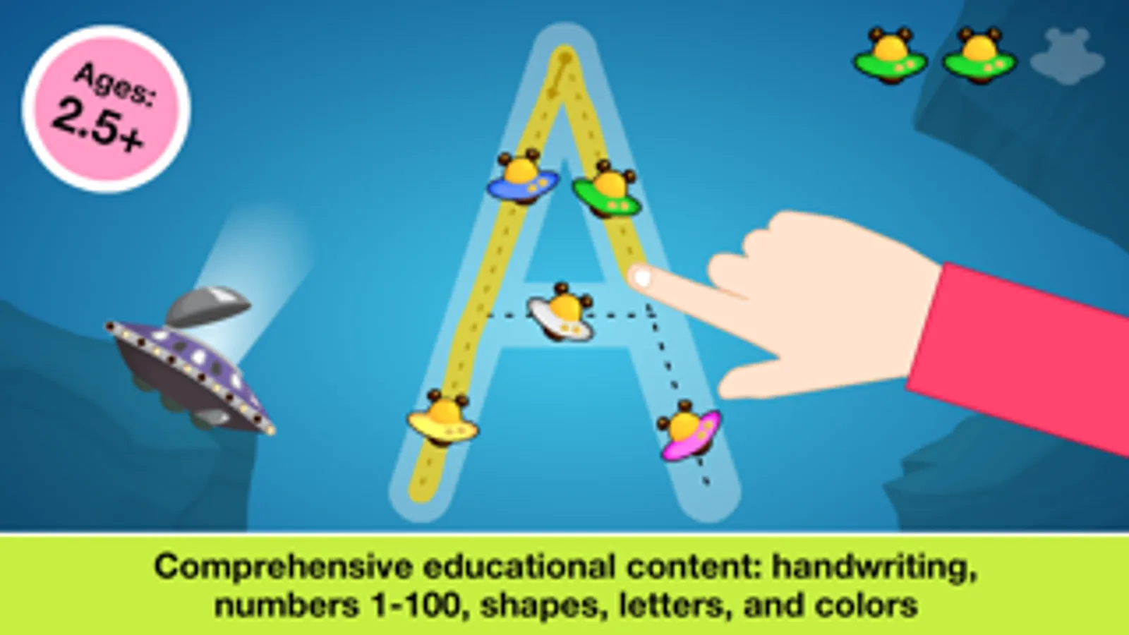 Preschool curriculum in one endearing alien-themed app. Land UFOs, explore extraterrestrial lands, vacuum the space, save the aliens, and much more. This fun-packed preschool educational adventure takes you out of this world to start a journey of learning. Have fun tracing letters, shapes, and numbers with aliens; or play 6 engaging educational mini-games to learn names of shapes, letters, numbers, and colors.