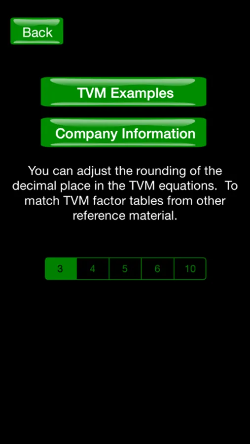 -TVM Manager has the ability change and save the decimal place of the multiplying factor in order to match different “Factor Tables” from other reference material. For example if you commonly use “Factors Tables” that are accurate to the 4th decimal place, you can set TVM Manager to calculate only to the 4th decimal place on the multiplying factor. This will insure that the results will match the tables that you commonly use.