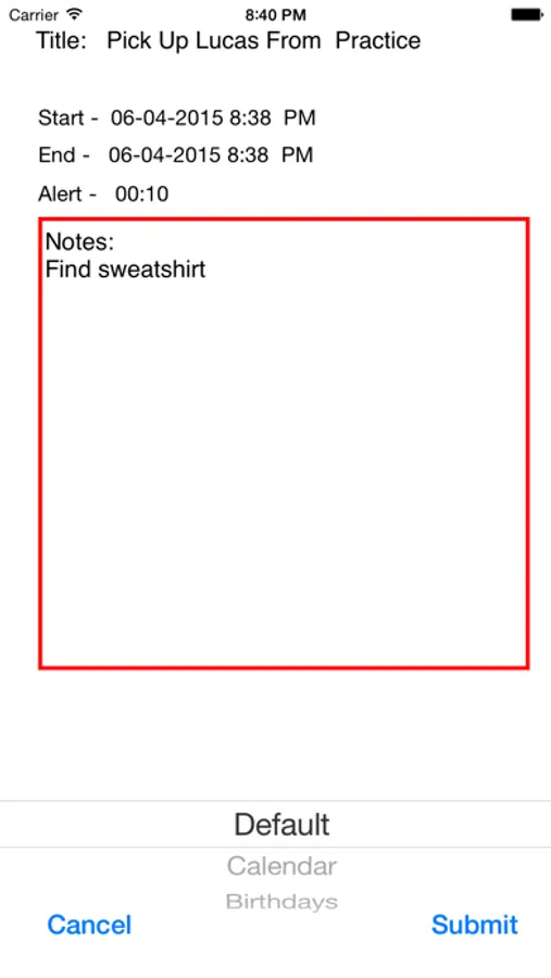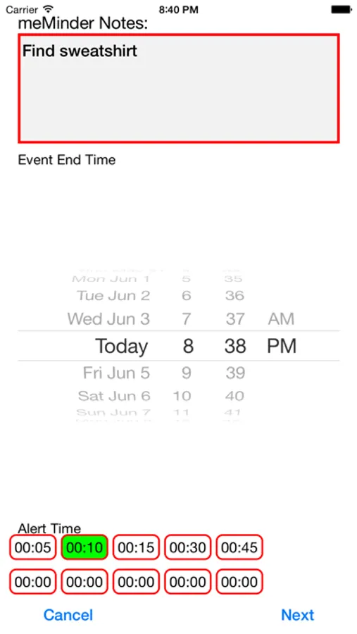 iPhone and iPad users enter the Events Start and End Times with a spinning Date/Time Picker Wheel. Users can configure 5 custom Alert Time buttons that best suit their preferences or use any of the 5 pre-defined Alert Buttons.