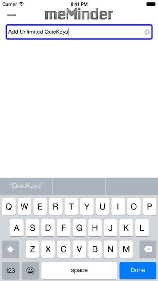 meMinder's convenient QuicKeys are great for speedy entry of repetitive Calendar Events and Reminders occurring at different times, like "Pick Up The Boys" for example or "Meeting @ Conference Center". It only takes a button tap to enter the pre-configured Titles.
