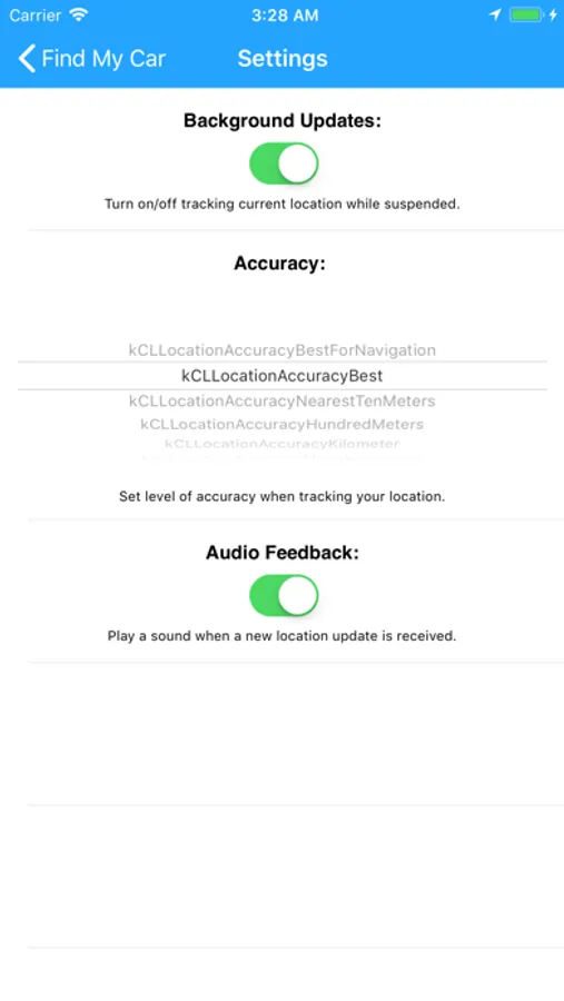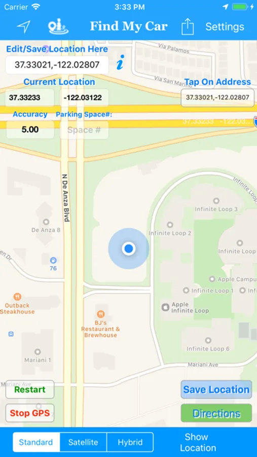 Find My Car!! is a GPS app.After parking press Save Location. To navigate back, Just Press Directions. Or you may Select All, Copy, press done, Directions and Paste the Address/Coordinates into the search bar. When turned on, it draws a trail to show where you have traveled. For best results, turn on wifi on your device. Need to find your car after exiting through the other side of the mall? Find My Car app will assist in finding your car. After you park your car, start the app(remember to enable wifi) and save the car coordinates by simply typing or copy/paste (for best results while you copy/paste, press the "Stop GPS" button) your coordinates into the window and press done. Restart the app. A trail will be drawn from your current location to your destination. Trace the trail back to where you parked. You may also enter GPS coordinates and/or street address in the "Save Car Coordinates Here" window. Copy the saved coordinates and press directions (apple map directions is opened). Paste the coordinates in the "To" section, press search then press go. The maps have standard, satellite and hybrid views. Continued use of GPS running in the background can dramatically decrease battery life.