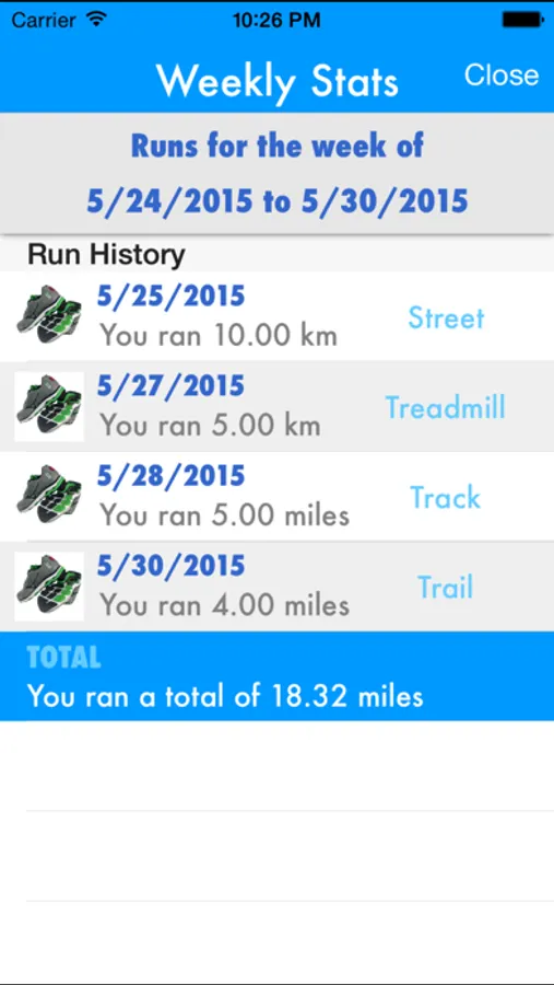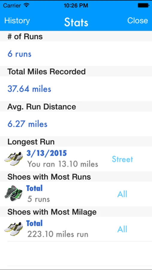 Additionally, Shoe Tracker gives you stats on your weekly runs and overall runs such as # of runs, total miles, average run distance, longest run, and more.