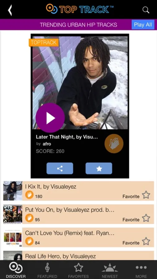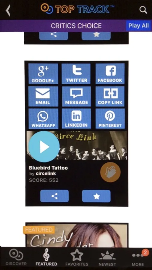Here is where all Music Artists can promote & share their music in social media... and be discovered by a massive audience! With 1 tap, they can share samples on Facebook, Twitter, Whatsapp, Google +, Pinterest, LinkedIn, email, texting, and more. Their Fans can listen, applaud, and re-share tracks, pushing them to the top of the leaderboards to become: TopTracks...and be discovered by the music industry!