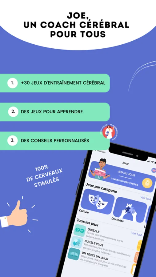 Vous souhaitez entraîner votre mémoire avec des jeux qui vous font plaisir ? Découvrez le programme de jeux de mémoire pour adultes JOE, le premier programme d'entraînement mémoire grâce à des jeux ludiques et culturels. Grâce aux conseils de votre coach JOE, vous allez pouvoir donner un gros coup de fouet à votre mémoire.