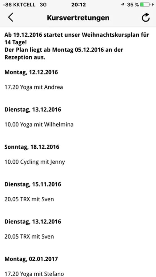 Direkter und aktueller Zugriff auf den Gruppentrainingsplan: Für jeden Kurs können Sie Details wie Zeit, Kursbeschreibung und leitender Trainer einsehen.