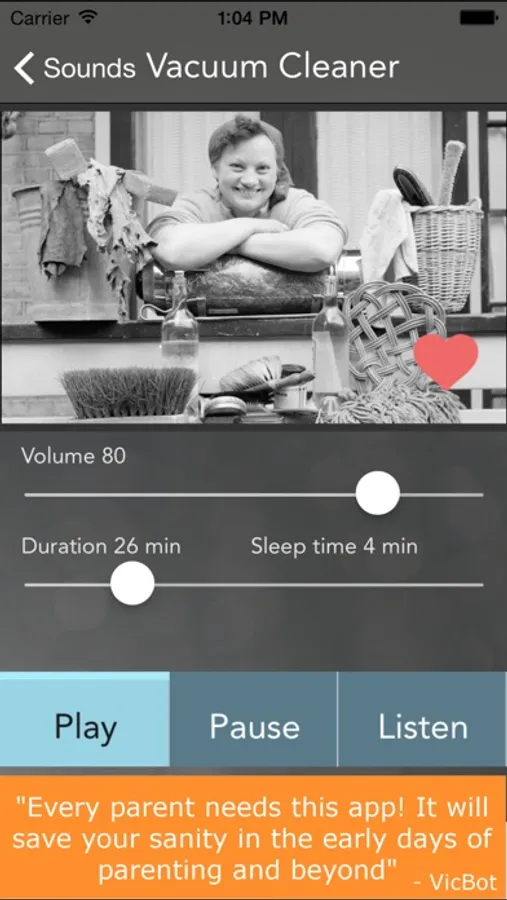 - Listen Mode: Your baby’s cry turns on the app automatically to soothe her at night.