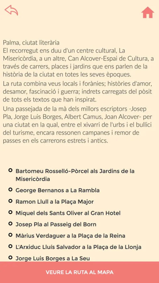 Connectam amb la veu dels autors que han escrit a Mallorca i sobre Mallorca. Les rutes ofereixen un viatge guiat per escriptors com Jules Verne, Agatha Christie, Camus, Borges, Cela, Gertrude Stein i Anais Nin, a més de gran representació d’escriptors en llengua catalana: Villalonga, Pla, Blai Bonet... Guia actualitzada 2018.