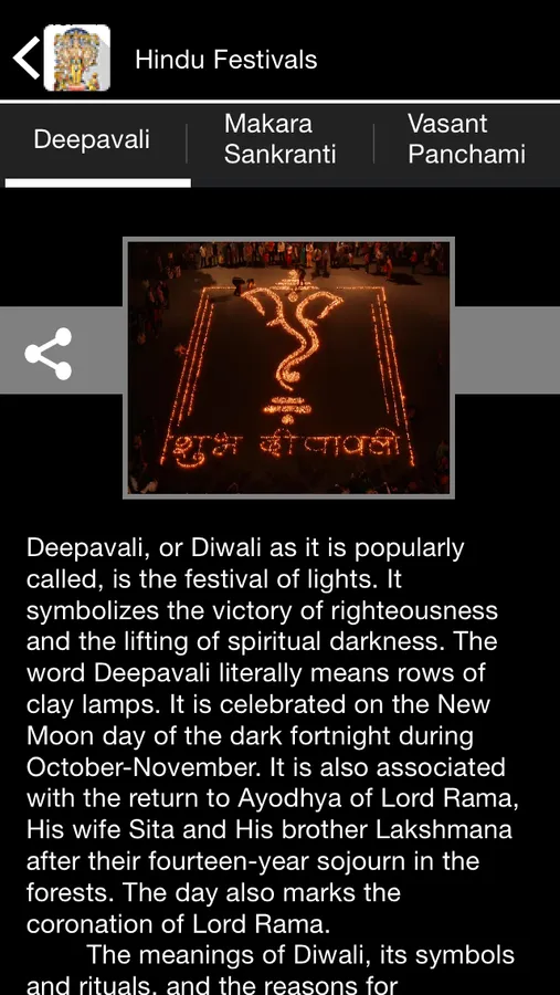Hindu Festivals: Deepavali , Makara Sankranti , Vasant Panchami , Maha Shivaratri , Holi , Gaura Purnima , Shri Rama Navami , Ugadi and Vishu , Hanuman Jayanthi , Guru Purnima , Onam , Raksha Bandan , Krishna Janmashtami , Ganesh Chaturthi , Navaratri , Dusshera , Karva Chauth , Gita Jayanthi