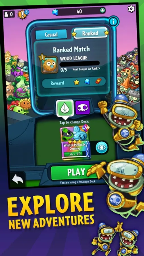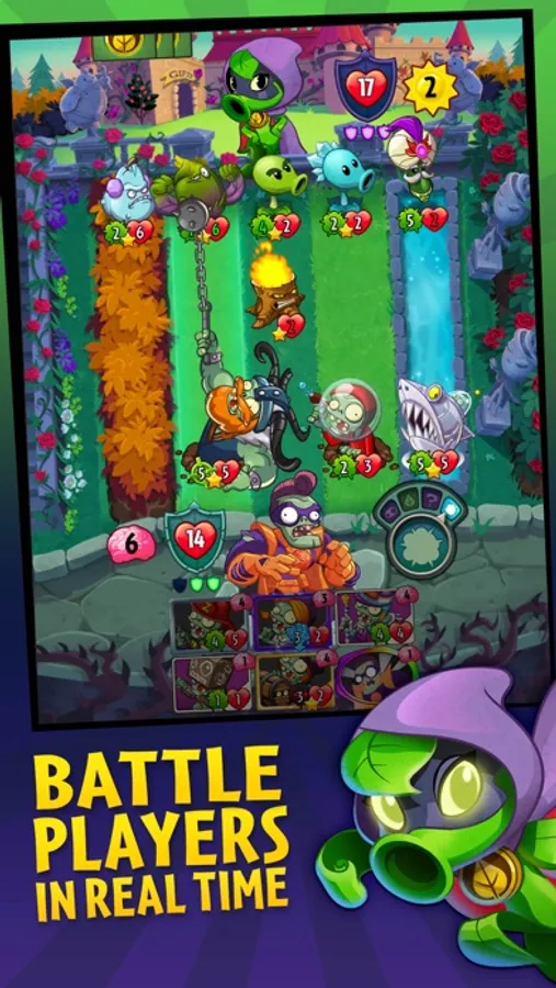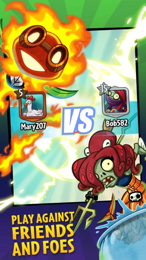 BATTLE FRIENDS AND FOES Test your deck when you take on other players or challenge your friends in exciting real-time matches. Practice tactics in casual multiplayer battles or enter competitive ranked play to compete with the best players in the world. Earn rewards for defeating the bite-iest adversaries, and build your bank when you complete Quests from Crazy Dave and Dr. Zomboss.
