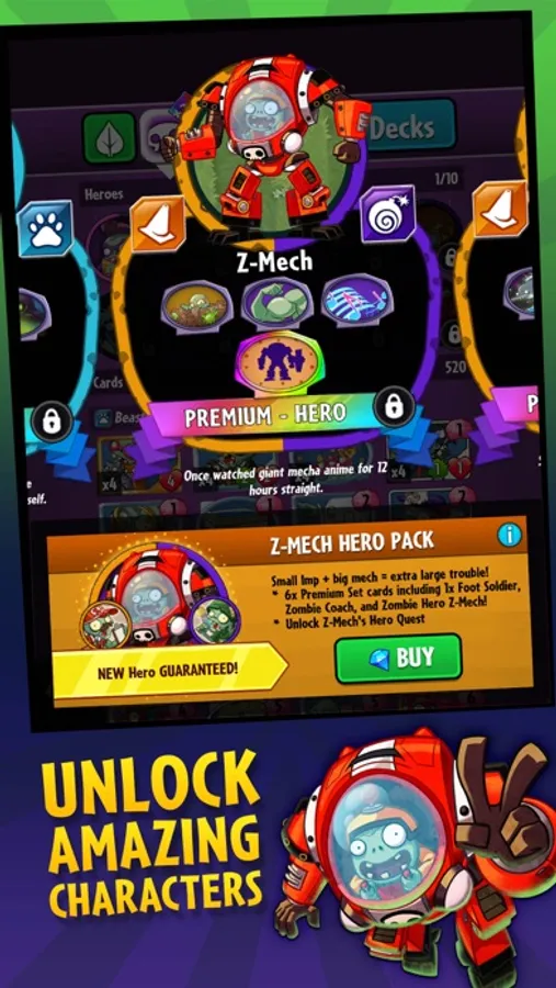 GROW YOUR TEAM Every hero needs a crew. Build yours and diversify your skills by collecting or crafting hundreds of cards – from the PvZ characters you know and love, to daring original plants and zombies. Devise distinct strategies when you select cards compatible with your hero, and experiment with devastating combos. Use the Deck Builder to quickly construct winning decks, try out strategies, and upgrade your decks as you collect and craft characters.