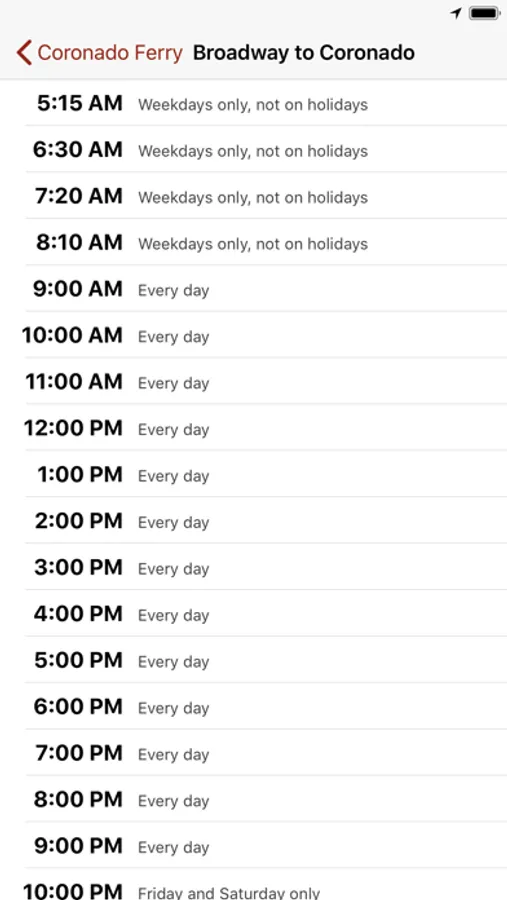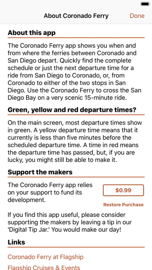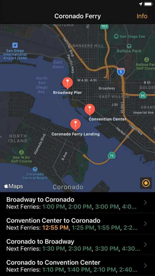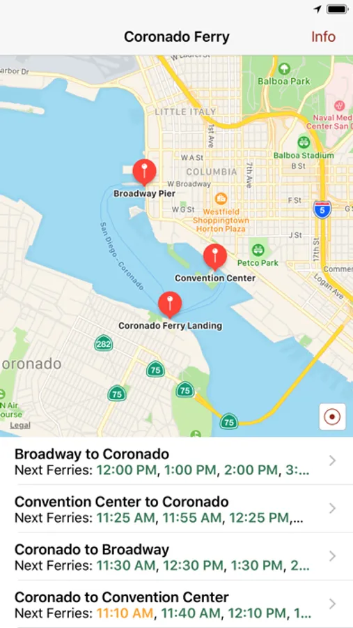The Coronado Ferry app shows you when and from where the ferries between Coronado and San Diego go. Quickly find the complete schedule or just the next departure time for a ferry from San Diego to Coronado, or, from Coronado to either of the two stops in San Diego. Use the Coronado Ferry to cross the San Diego Bay on a very scenic 15-minute ride.