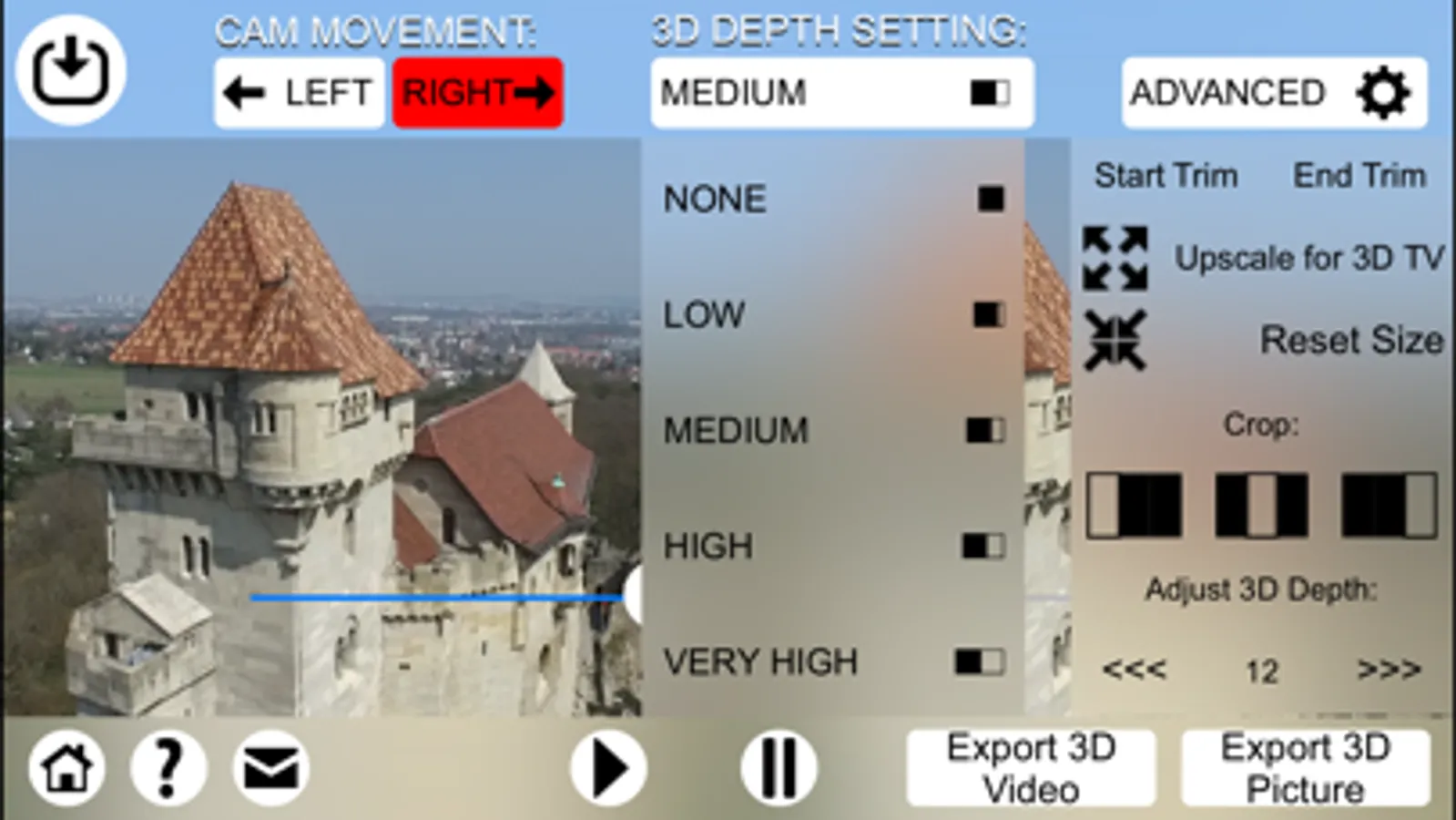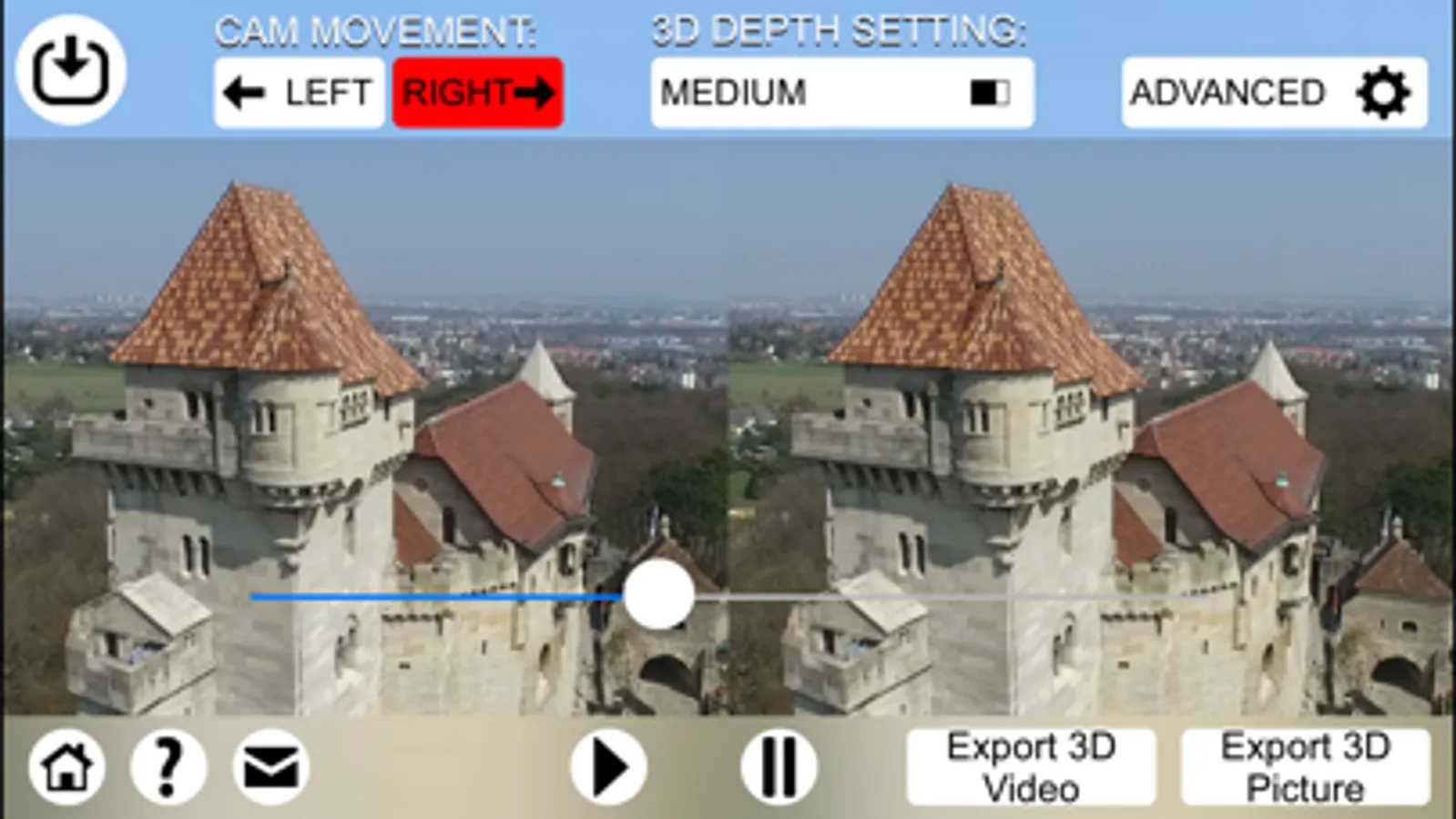 Export and save the 3D video or still images that to your gallery, and can be viewed using every 3DTV and virtual reality headset, such as Google Cardboard.