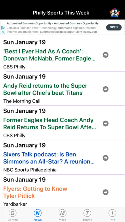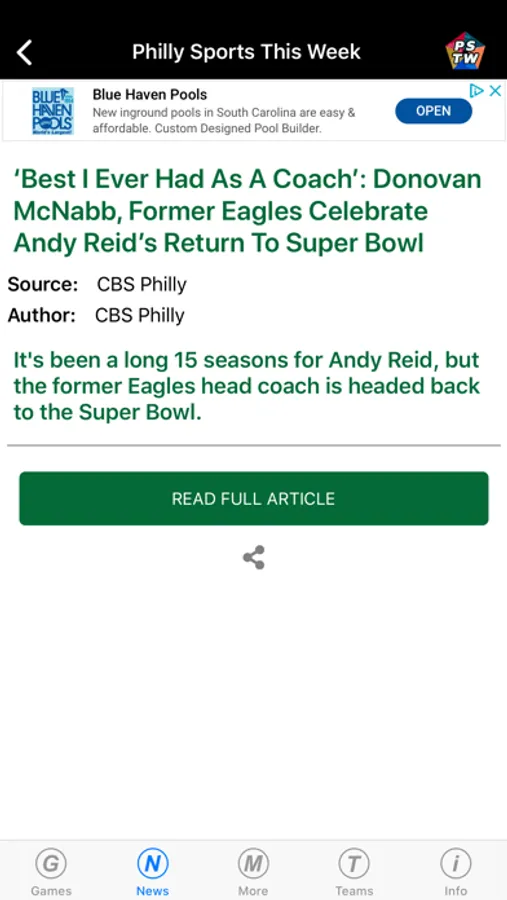 The new feed page displays the latest headlines for the teams from various RSS feeds. Select a headline to read a summary and read the full article with a click of a button.